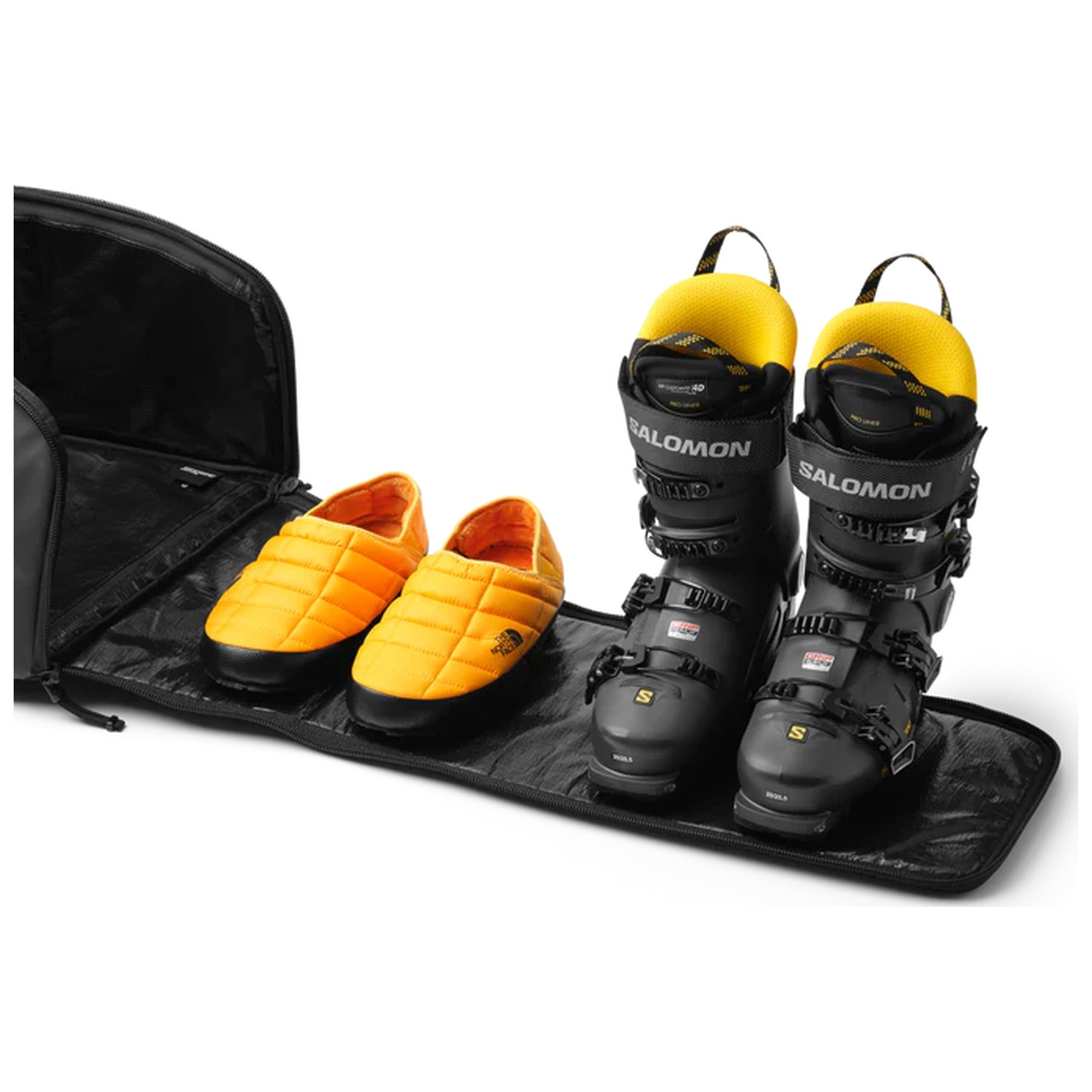 Frontpanelen öppnas helt och hållet så att du snabbt kan gå från ryggsäck till ombytesmatta. En integrerad, vattenavvisande sittdyna kan fällas ut när du behöver en torr plats att byta om eller vänta. Insidan är klädd i ett avtorkningsbart, vattenresistent tarp-material som tål både smuts och väta. Axelremmarna kan stuvas undan vid incheckning, och tre fleecefodrade fickor skyddar goggles och glasögon under hela resan.