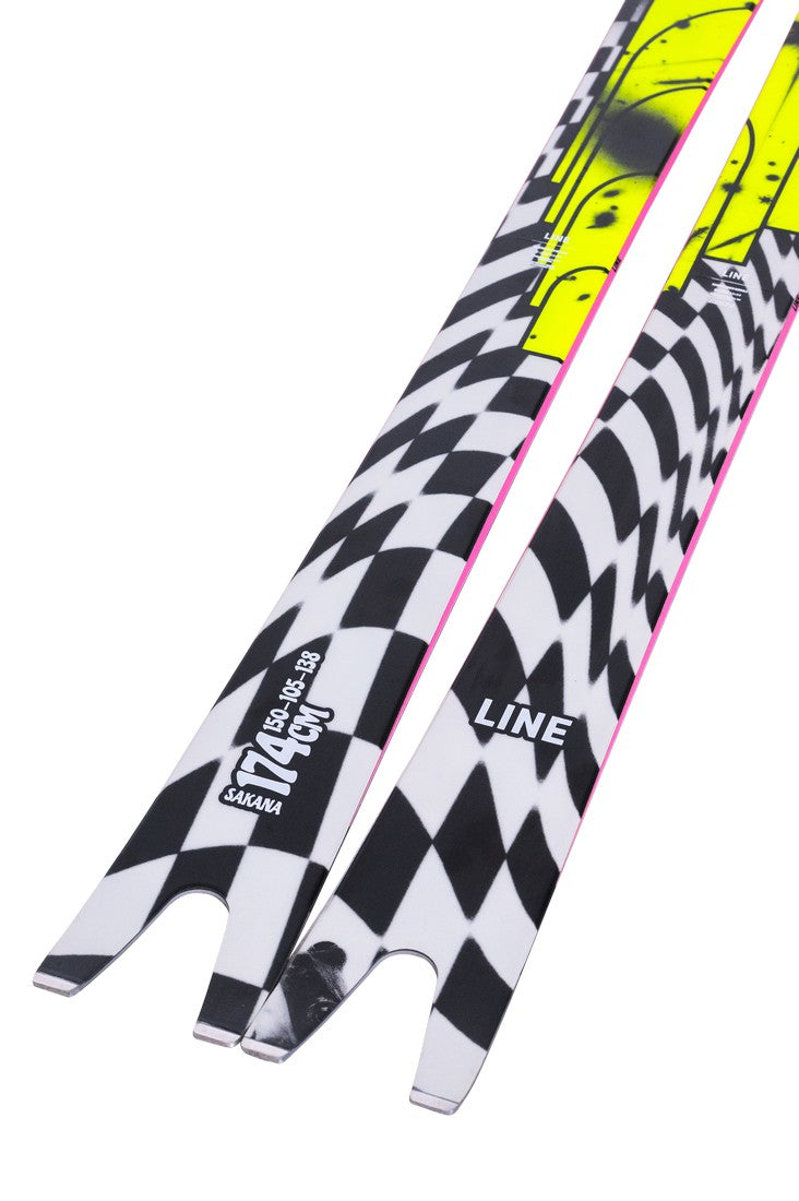 Line Sakana är en riktigt unik skida som utmanar gränserna i skiddesign. Ett riktigt euro-carving monster och det gäller att hålla i sig när man trycker på! Med en distinkt swallowtail-form kombinerat med camber och en superbred tip är denna skida byggd för att leverera både smidiga carvingsvängar på hård snö och en surfande känsla i puder. Den är också mjuk, vilket ger en otroligt lätt sväng initiering. Sakana sticker verkligen ut på berget, både i prestanda och design, och erbjuder en smått unik åkupplevelse.