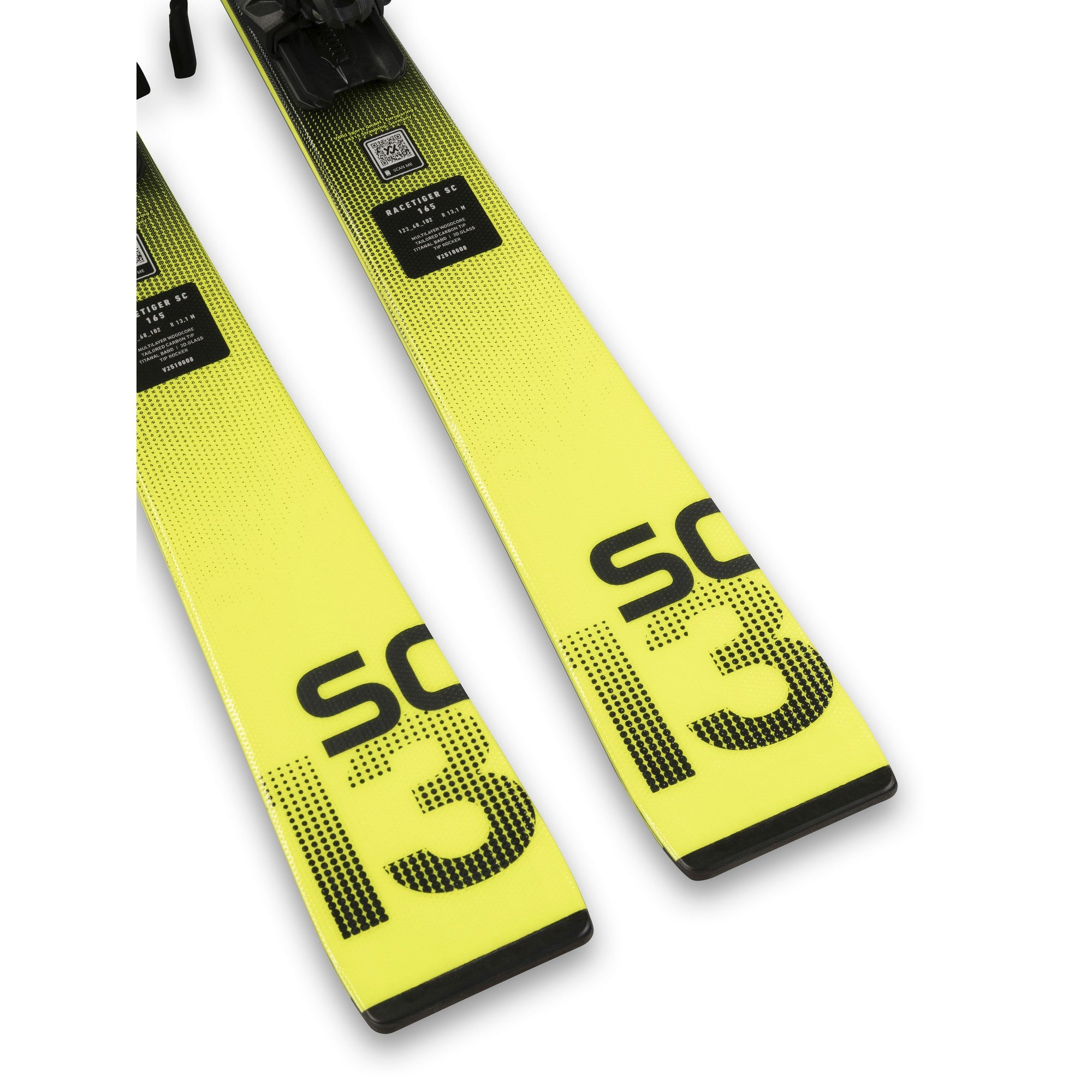 Racetiger SC levereras med Völkls V-MOTION bindningar som skjuts på "railen" som är inbyggd i skidan. Dvs att den tar alla pjäxstorlekar och är enkel att ställa om själv om det skulle behövas.