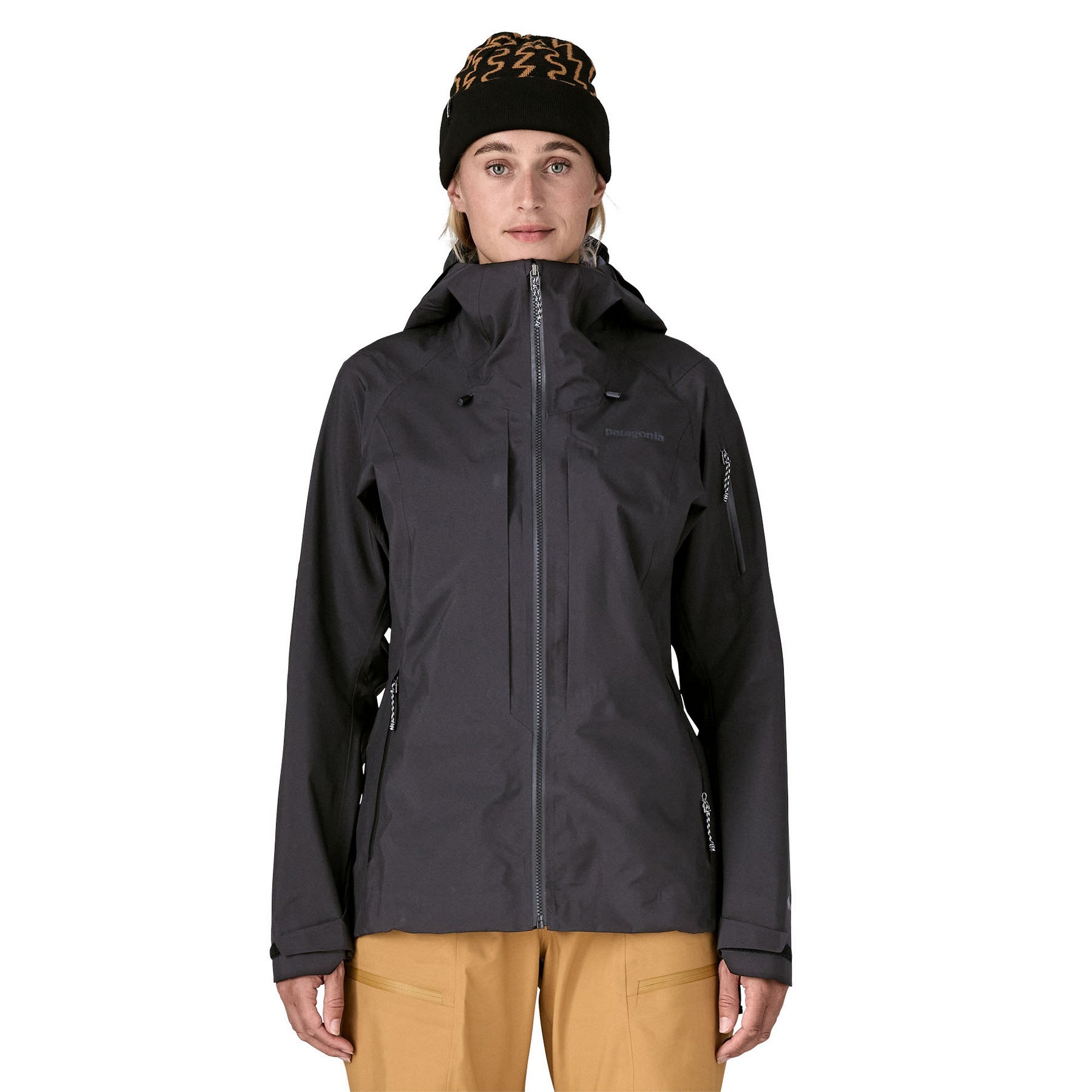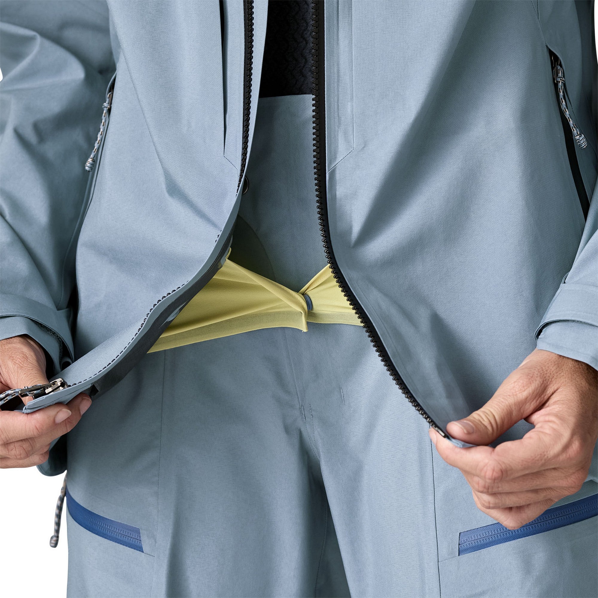 Fast hjälmkompatibel huva med dolda stretchpaneler gör att den sitter bra även med hjälm på. Ventilationsdragkedjor under armarna släpper snabbt ut överskottsvärme vid klättring. Invändigt snölås kan justeras och fällas undan när den inte används. Vattentäta dragkedjor som är lätta att hantera även med handskar på.
