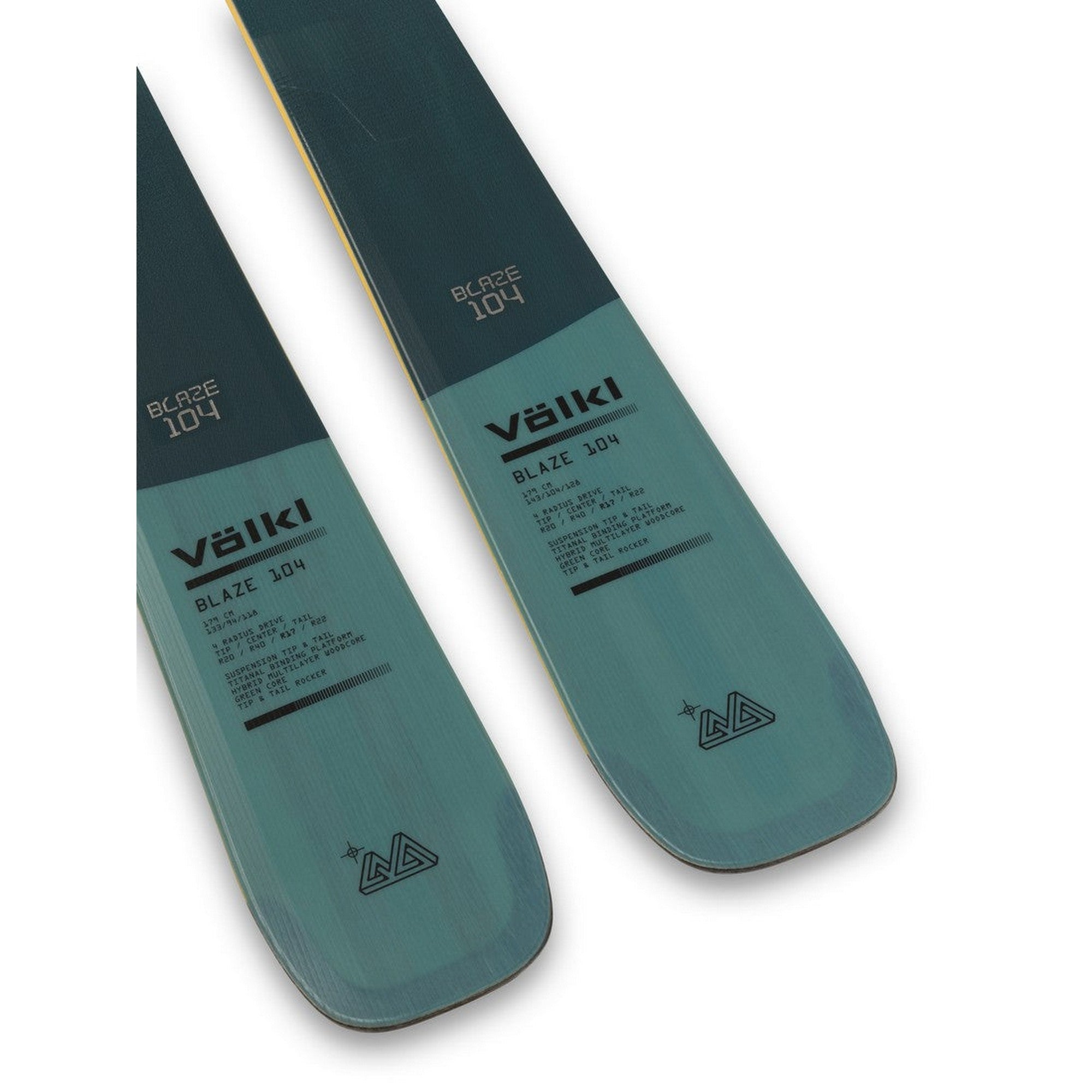 Blaze 104 har en lättviktskonstruktion med en komplex träkärna speciellt framtagen för både friåkning och toppturer. Skidan har poppel längs kanterna för stabilitet och paulownia-trä i mitten för att minska vikten och öka smidigheten. I området där bindningarna fästs används bokträ för att säkerställa att de sitter som berget. Kombinationen av dessa träslag ger en balanserad känsla mellan stabilitet och lekfullhet.